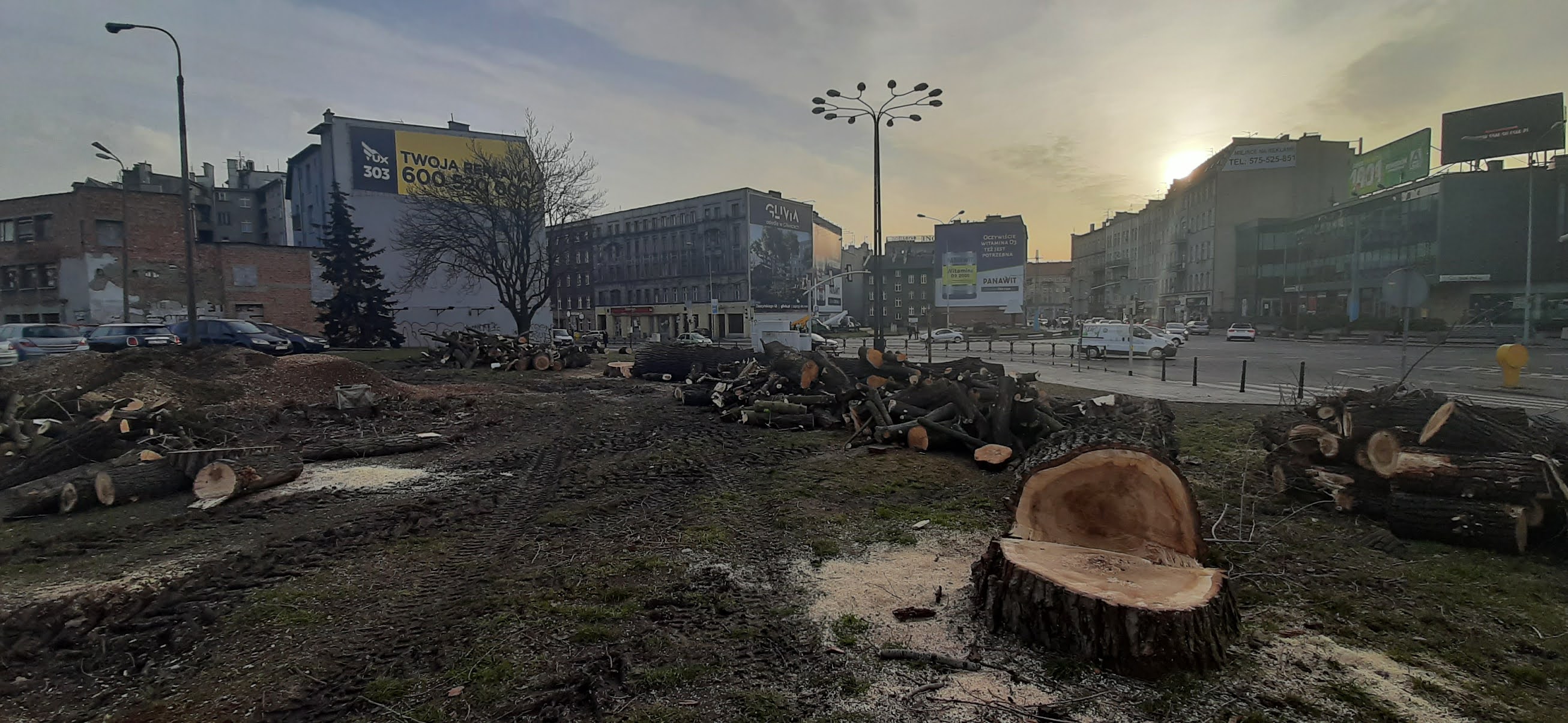 Niestety, zrobiono to "po gliwicku", na początek doprowadzając przestrzeń publiczną do stanu agonalnego, aby na koniec dokonać spektakularnej rzezi drzew. Dlaczego "po gliwicku" ? Bo drzewa i zieleń są jakąś obsesją miejscowych władz. Jeszcze niedawno głośna była sprawa wycinki lipowej alei przy ulicy Mickiewicza (którą na szczęście po długiej batalii uratowali mieszkańcy wpisując ją do rejestru zabytków), budowy polderów zalewowych w miejscu służących dzisiaj rekreacji łąk przy ulicy Słowackiego (chwilowo odłożone), zniszczenia tzw. Wilczych Dołów, wycinki szpalerów drzew wzdłuż rzeki Kłodnicy itd. Każdego dnia pod topór idą kolejne drzewa, pod pozorem ich złego stanu (jak widać na zdjęciach) lub kolizji komunikacyjnych, betonowane i asfaltowane są kolejne przestrzenie zielone. Do tego miasta nie dotarła wiedza na temat globalnego ocieplenia i jego skutków, sposobu zapobiegania klęskom żywiołowym typu susza czy powodzie. Nikt nie neguje potrzeby zmian w obskurnym centrum, jednak dlaczego robione jest to w taki sposób ? Dlaczego w mieście, gdzie działa prężny Wydział Architektury na Politechnice Śląskiej nikt nie wpadł na pomysł, że tak prestiżowa część centrum powinna być rozstrzygnięta za pomocą konkursu architektonicznego ? Dlaczego nikt nie zapytał ekspertów, jak powinno się projektować takie miejsca w zgodzie ze współczesnymi trendami, zamiast tego zlecając te prace najtańszemu wybranemu w przetargu ? Litościwie pomińmy nazwisko człowieka i członków zespołu, którzy "zaprojektowali" nową przestrzeń jakby mentalnie tkwili w latach 90-tych, albo i wcześniej. Katastrofalny projekt to tylko połowa dramatu, niestety według tego projektu musiały być wycięte wszystkie drzewa, zamieniając plac w pustkowie. Na ten projekt powołują się dzisiaj urzędnicy, tłumaczący że drzewa kolidowały z jego realizacją, jakby były to tablice dziesięciu przykazań przekazane Mojżeszowi, a nie uzgodnione wcześniej wspólne założenia. W związku z tym "nic nie można było zrobić", nawet wtedy gdy pojawili się protestujący mieszkańcy i społecznicy. W zamian zasadzone zostaną setki nowych drzew, niestety nie podano gdzie, bo na wizualizacjach ich nie widać.